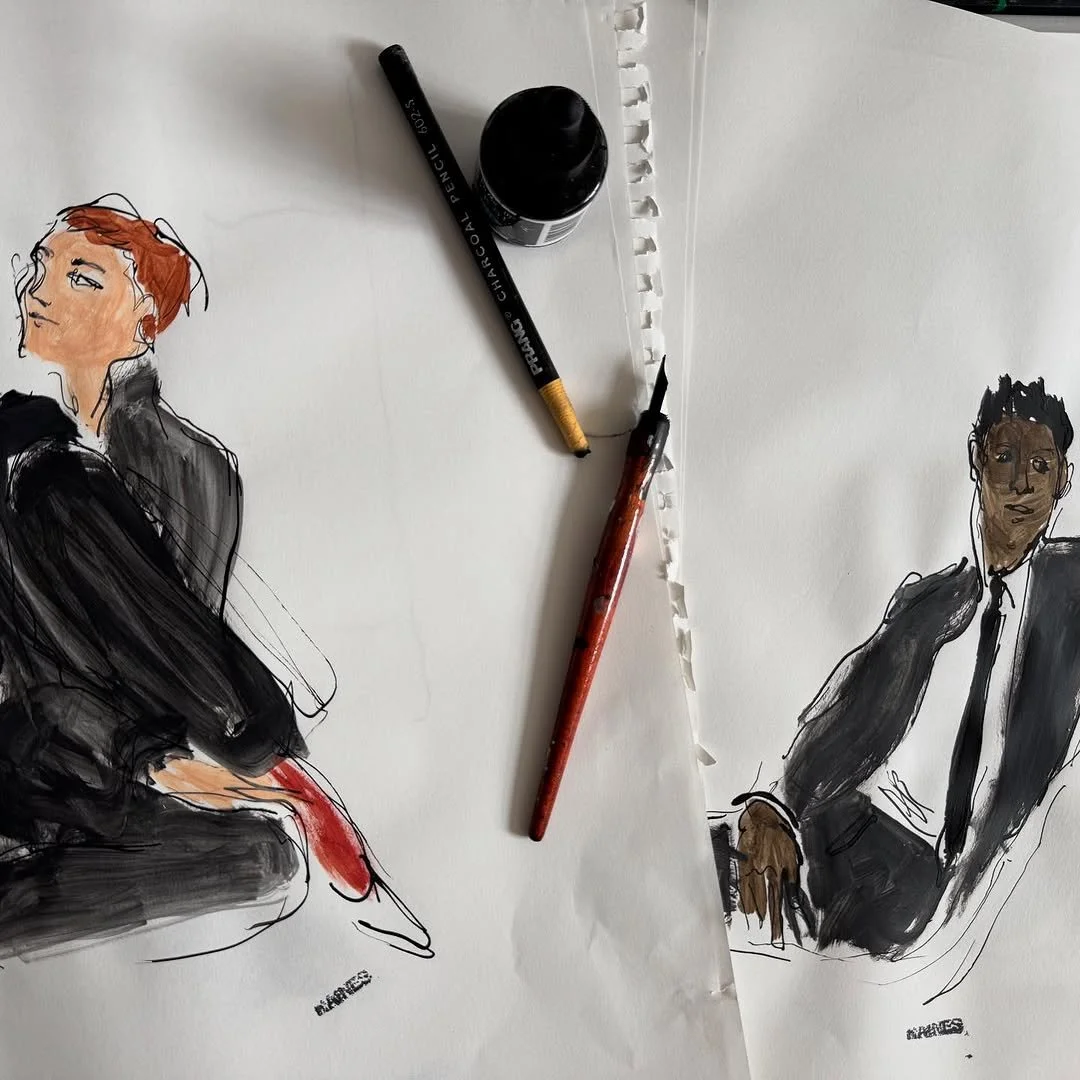 It’s no secret that Richard Haines is one of the most beloved illustrators in the fashion world, and those who know him know he can generally be found busy at work in his Bushwick studio. Lately, however, he’s been out working his magic live and in person: in September and October alone, Richard could be seen creating behind the scene pieces at the Todd Snyder show, drawing portraits at Theory, ‘live drawing’ at a Marfa Stance event, and he even made an appearance in the Tuckernuck catalogue! To immortalize the proverbial cherry atop of the cake of this fashion season, Richard captured the final moment of Chanel’s SpringSummer ‘26 collection at Paris Fashion Week. When asked about how busy and on the go he’s been, Richard replied with some valuable perspective: