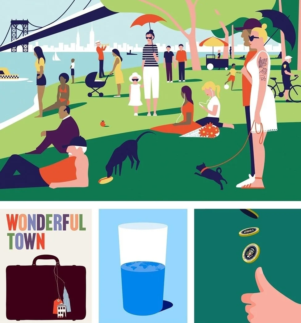 I graduated from Parsons a year after the iPhone was released and since then it’s been the steady rise of screens. My career really feels like it’s gone from grayscale to CMYK to RGB. When I was starting my career, one of the points of entry for illustrating for The New York Times was their letters section. The illustrations would be smaller than 2’’ x 3’’ and black and white only. Now that seems as ancient as the rule from college about designing a logo so that it’s still legible when faxed.