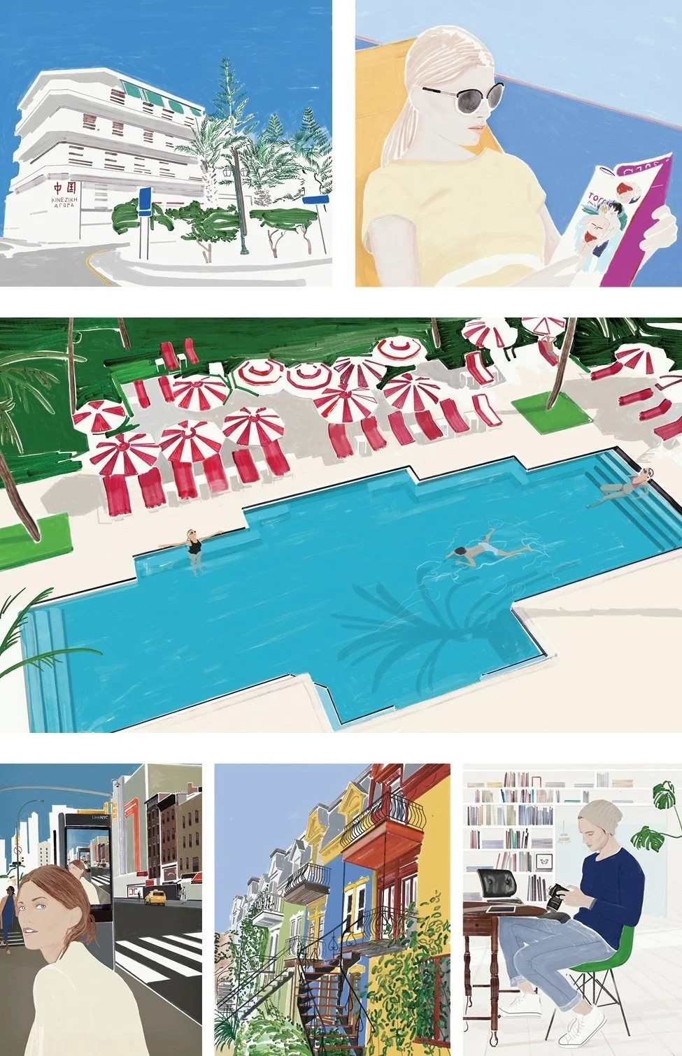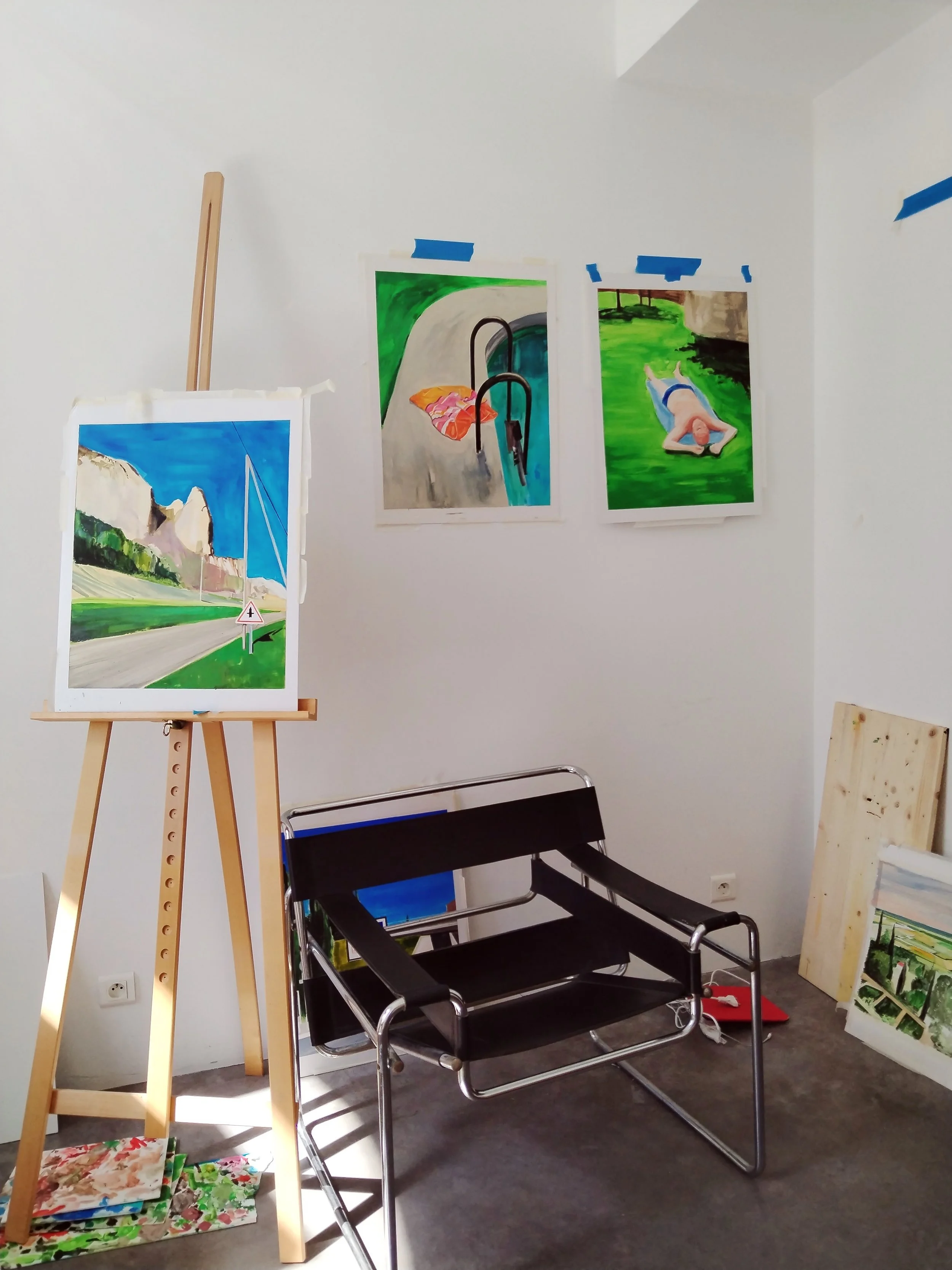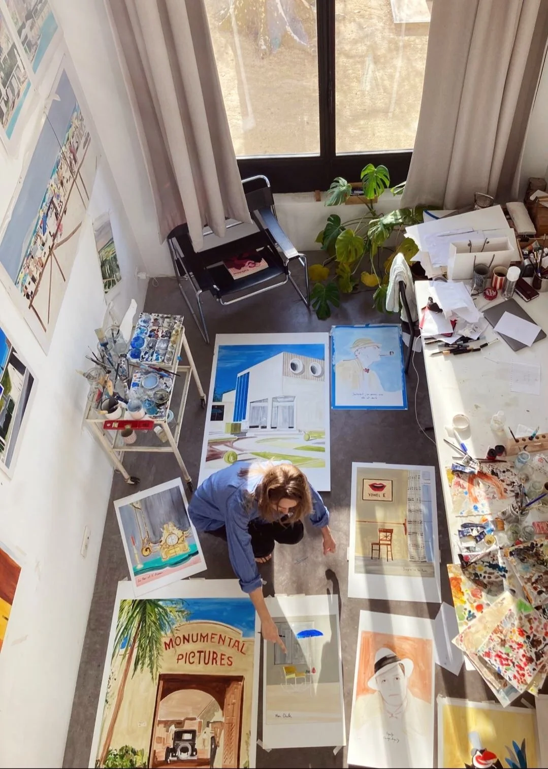 It was for a luxury hotel in Casablanca where I created 3 triptychs. The brief was inspired by three films: Mon Oncle, Singin' in the Rain and The King and The Bird. I watched the films and took screenshots each time I saw an image that inspired me, then I sent these captures to the client, adding text taken from the film. What started as pencils then became large oil paintings… the formats were as big as the deadline was short, but it was very exciting to do, I loved it!